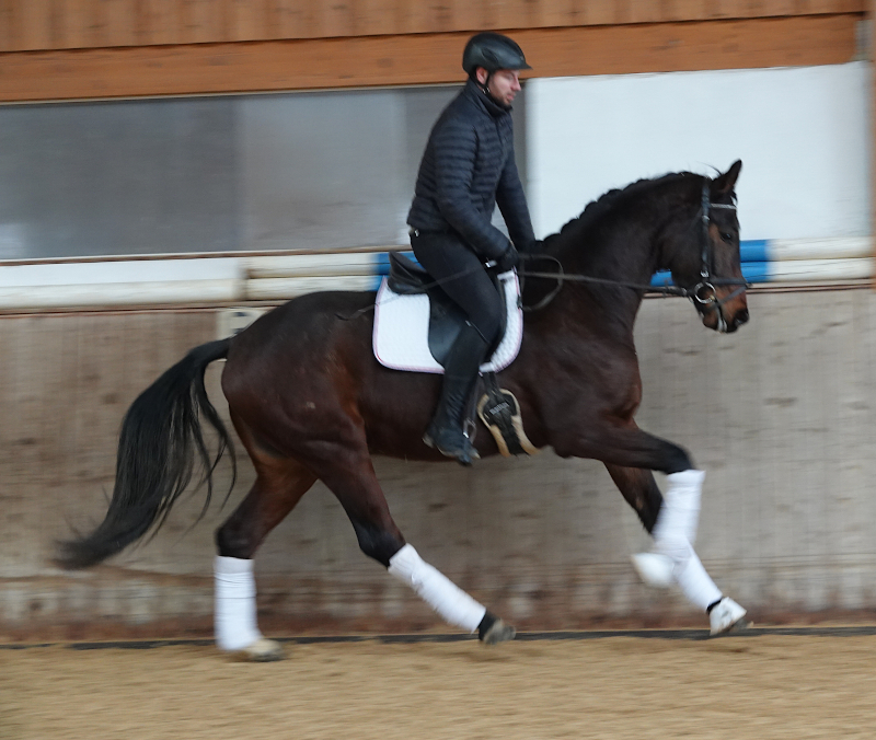 RPZ Frangelico ist ein absolutes Traumpferd! Er ist nicht nur bildschön und hat 3 hervorragende Grundgangarten, sondern ist auch noch äußerst unkompliziert, nervenstark und umgänglich. Obwohl erst kurz unter dem Sattel zeigt er bereits sehr eine verblüffende Rittigkeit mit hervorragender Hinterhandmechanik. Beste Voraussetzungen für eine traumhafte Karriere als Dressurpferd. Aus der Mutterlinie kommen bereits bis Intermediaire erfolgreiche Nachkommen.